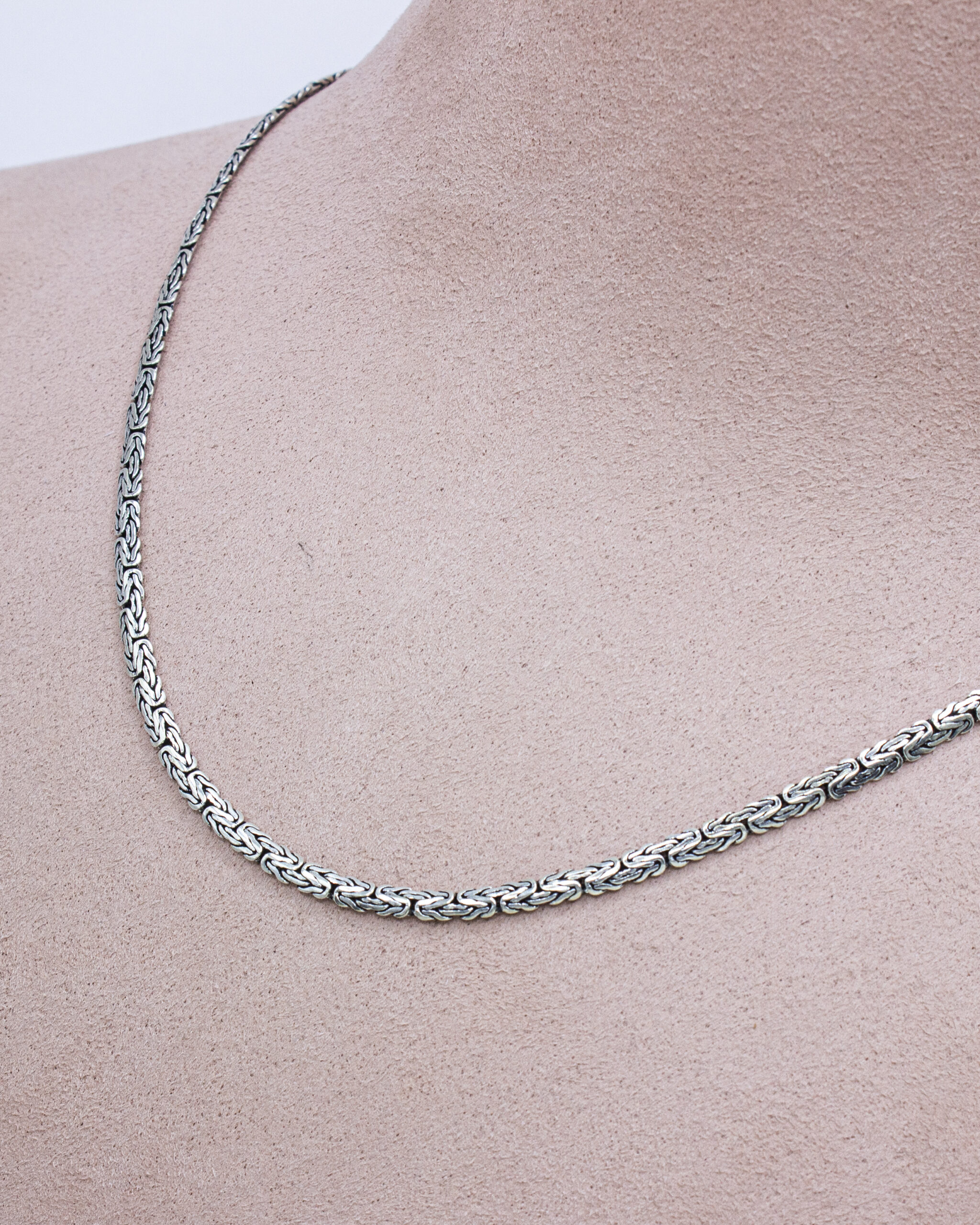Crafted from high-quality sterling silver, the chain is given a subtle oxidized finish, which highlights the depth of its interwoven links and lends it a sophisticated, slightly vintage appeal. Its robust construction ensures durability and a weighty feel, making it perfect for wearing as a standalone statement piece or for complementing a masculine pendant. This chain is an essential accessory for men who value quality, heritage, and timeless design.