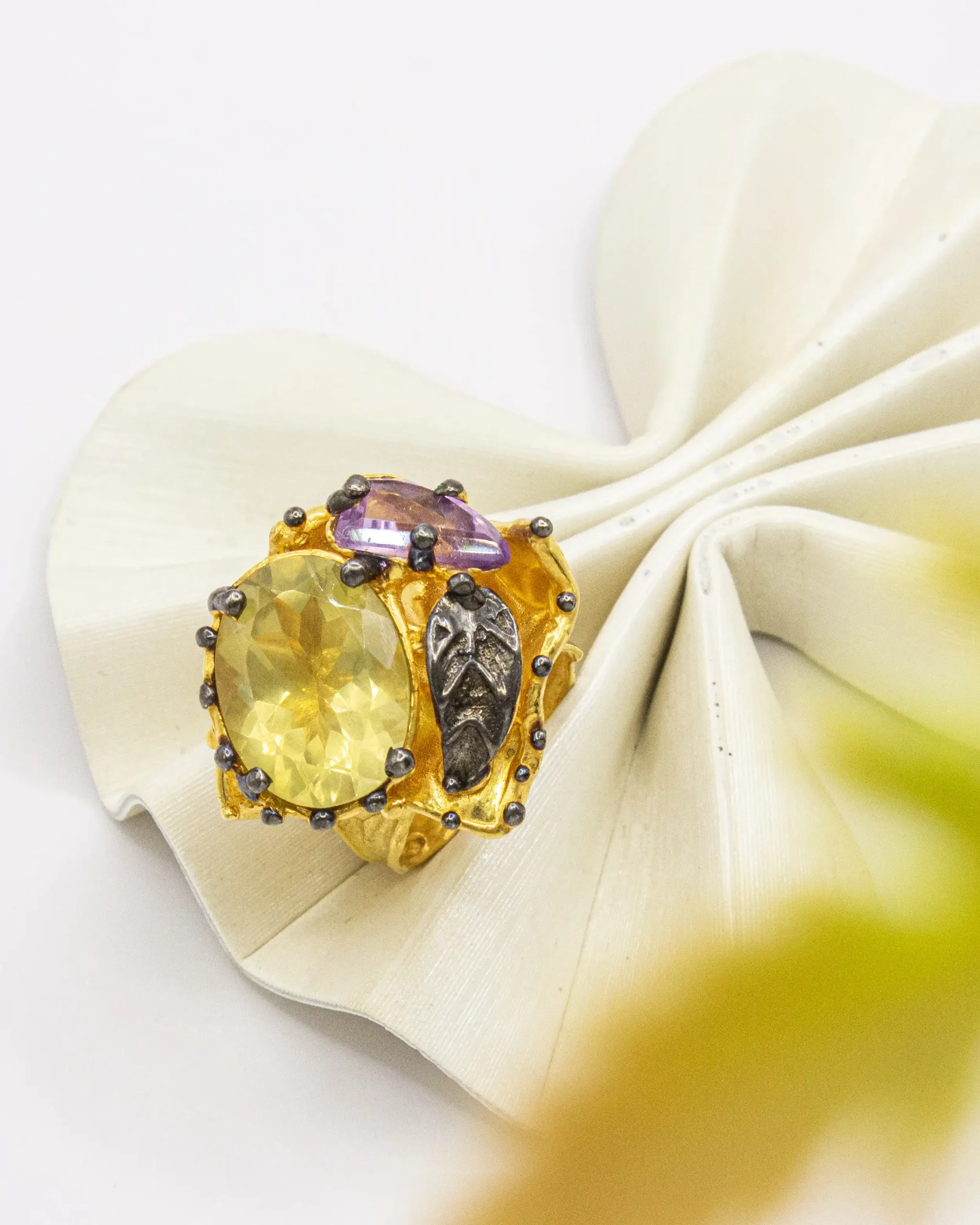 The centerpiece is a magnificent, faceted Citrine, radiating a warm, sunny yellow hue that symbolizes joy and abundance. Complementing its brilliance is a rich, regal Amethyst, with its characteristic purple tones adding a touch of sophisticated charm. Nestled beside them is a enigmatic Black Spinel, its deep, lustrous black providing a dramatic contrast and an edgy elegance to the vibrant array.