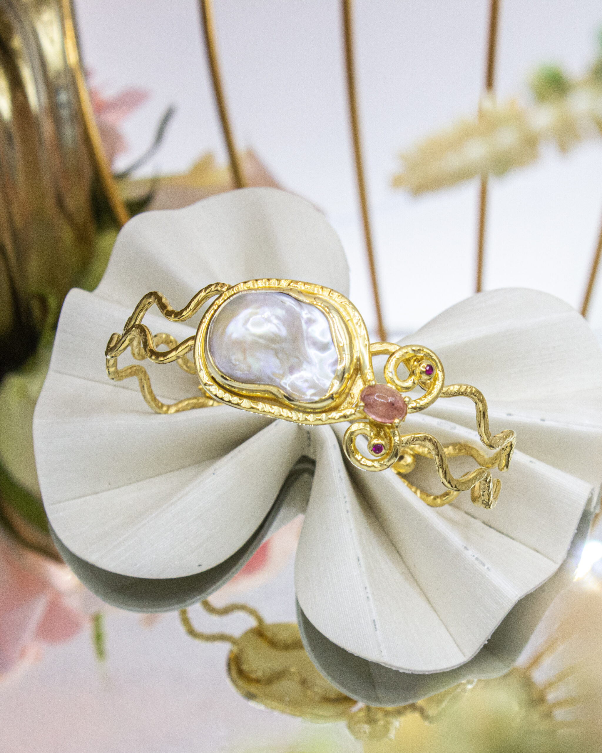 Design: Double-banded cuff bracelet with a large baroque pearl centerpiece set within a gold-toned, wavy design, adorned with colorful gemstones