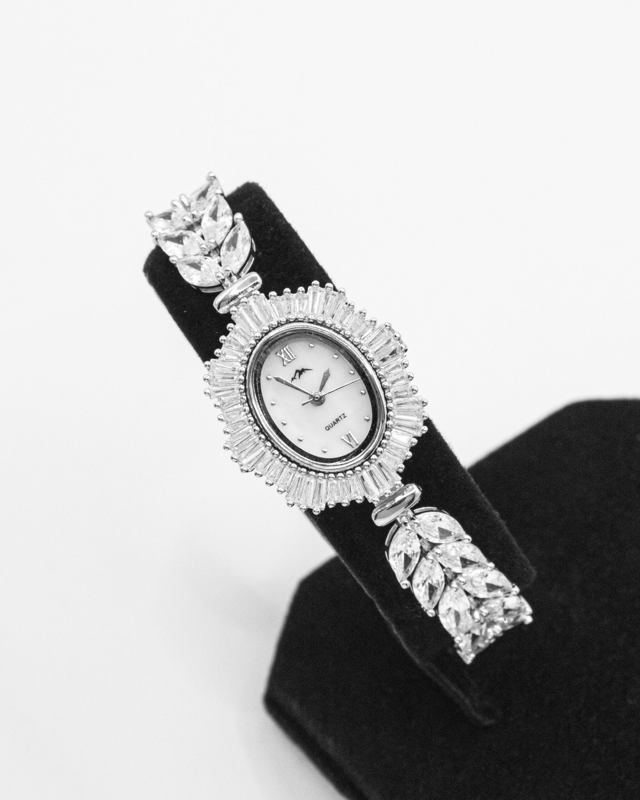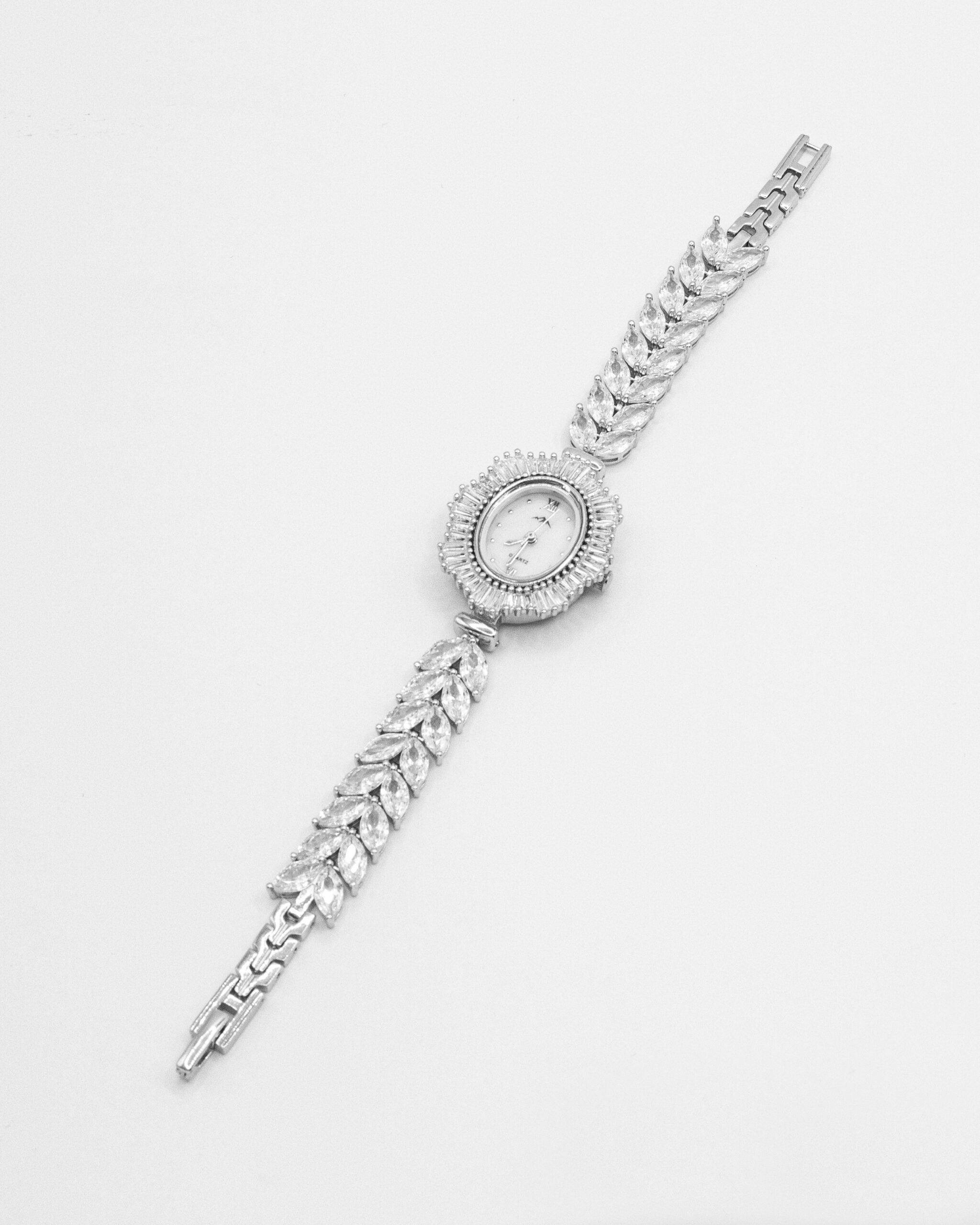 Meticulously crafted from high-quality sterling silver, the watch features a captivating oval face, dramatically framed by a spectacular bezel of radiating marquise-cut cubic zirconia crystals, creating a dazzling sunburst or petaled effect. The classic white dial showcases elegant Roman numerals, providing a sophisticated contrast to the sparkling surround, while “QUARTZ” confirms its reliable movement. The grandeur extends to the bracelet, which connects to the watch head with elaborate clusters of marquise-cut crystals, artfully arranged to resemble shimmering leaves or delicate petals. The entirety of the design speaks to a lavish aesthetic, set to maximize light reflection and undeniable sparkle. This watch is the epitome of high-impact elegance, perfect for grand occasions or as a luxurious centerpiece to your most distinguished ensembles.