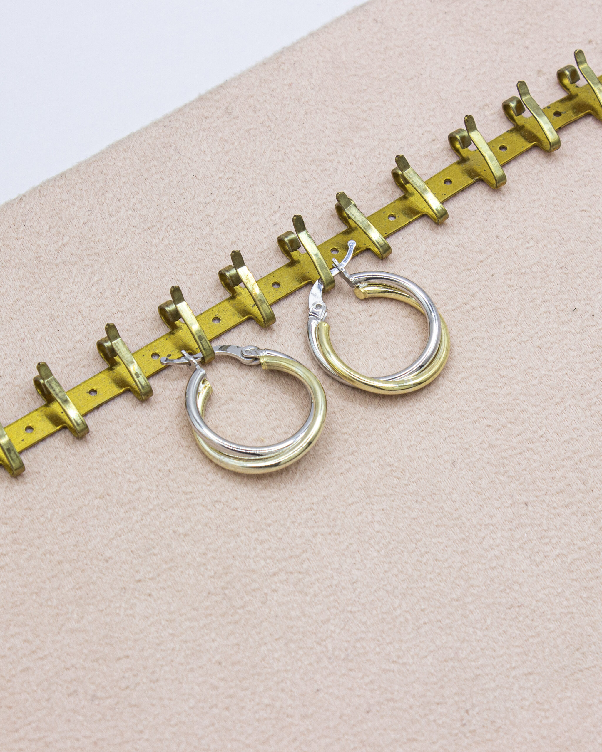 Design: Double oval hoop earrings with one polished silver and one gold-plated hoop