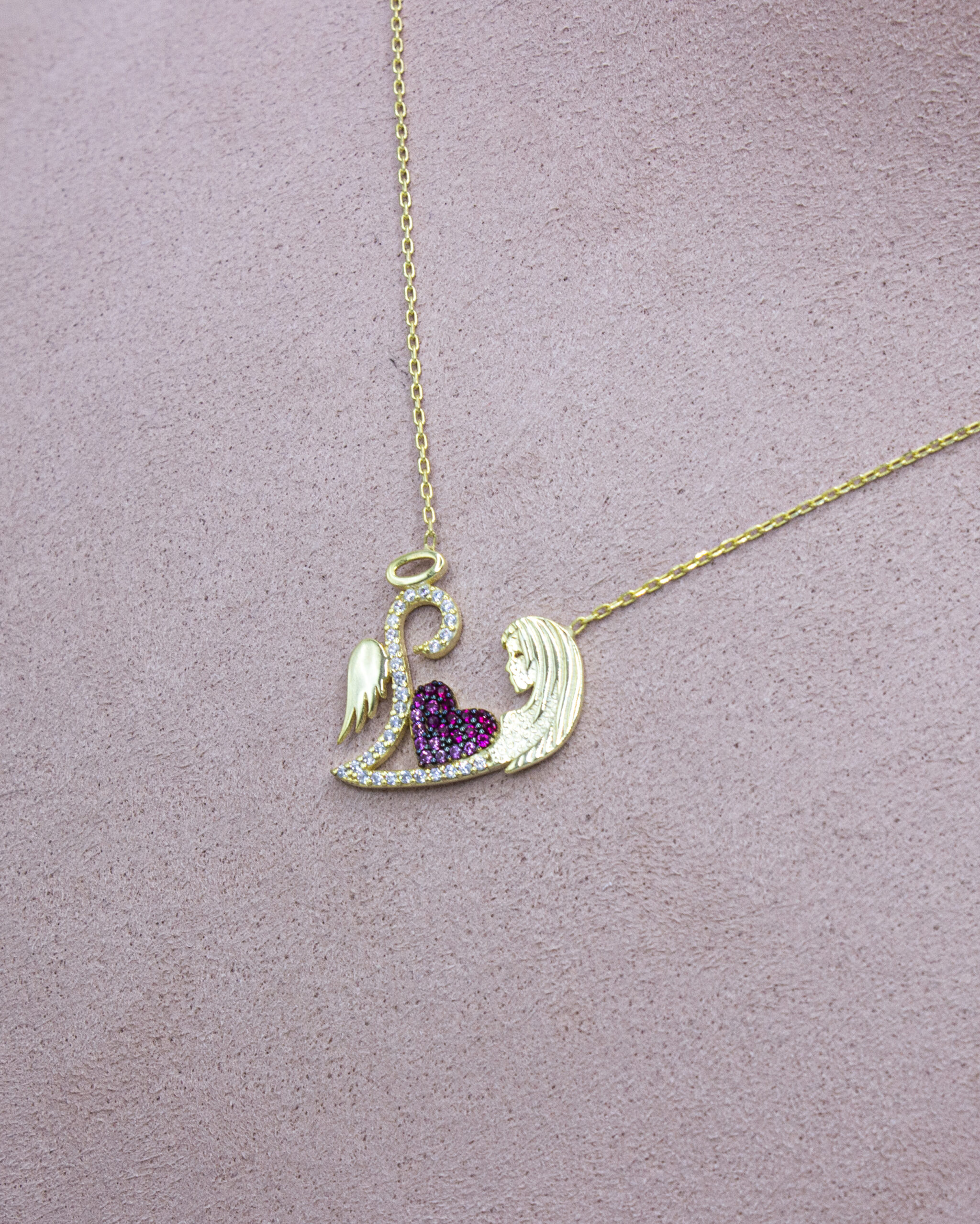 Central to this tender embrace is a brilliant heart-shaped motif, richly adorned with pave-set ruby-red cubic zirconia stones, radiating warmth and passion. The wings of the angel and accents on the woman’s profile are delicately highlighted with clear pave-set cubic zirconia, adding a subtle sparkle. The entire pendant is crafted from high-quality sterling silver with a luxurious gold-plated finish, enhancing its precious feel. This necklace is an ideal gift, embodying protection, love, and spiritual connection.