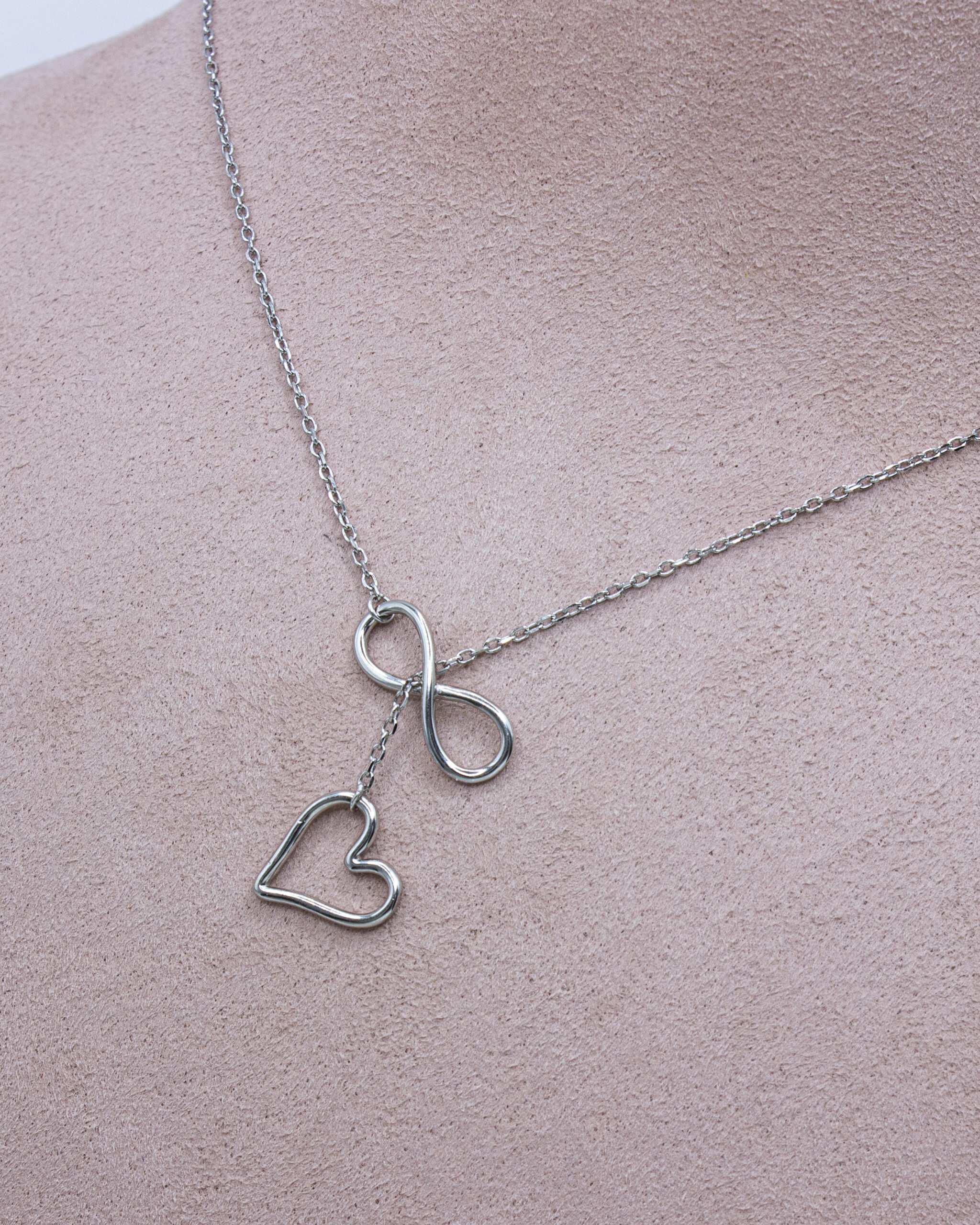 Design: Chain necklace with an infinity symbol pendant, from which an open heart dangles