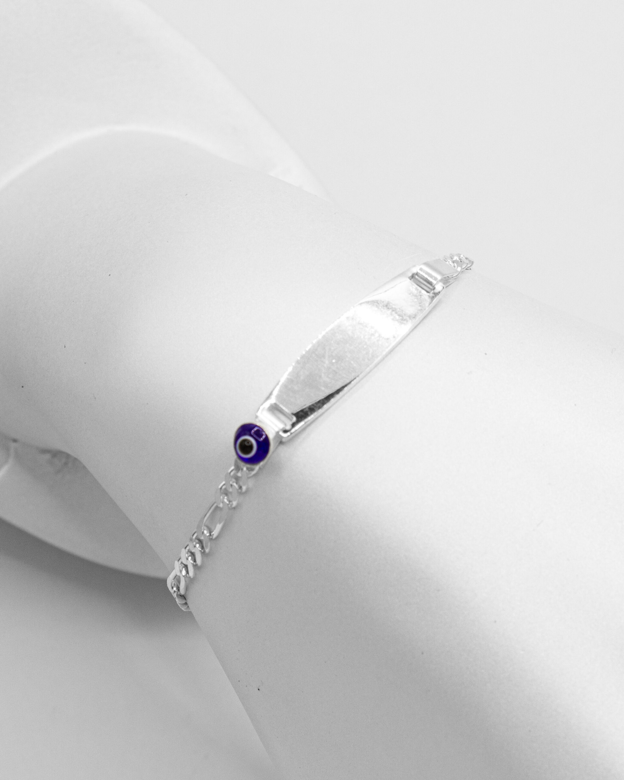 At the center of a sleek, polished silver ID bar is a vibrant, round evil eye bead, crafted with dark blue, light blue, and white concentric circles. This traditional Turkish motif is believed to ward off negative energy and bring good luck, making this bracelet both beautiful and meaningful. Perfect for a child’s delicate wrist, this bracelet combines traditional protection with a touch of modern style.