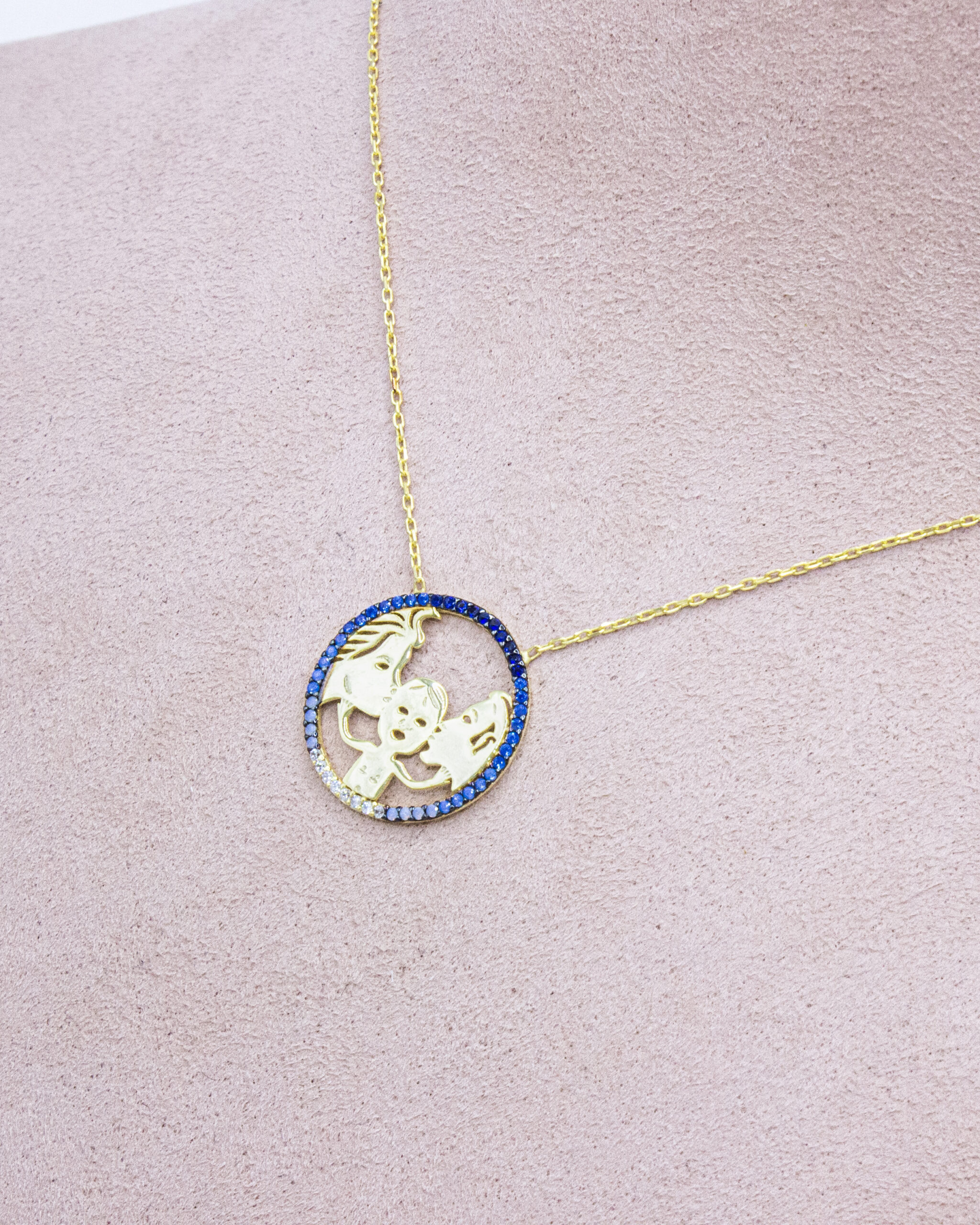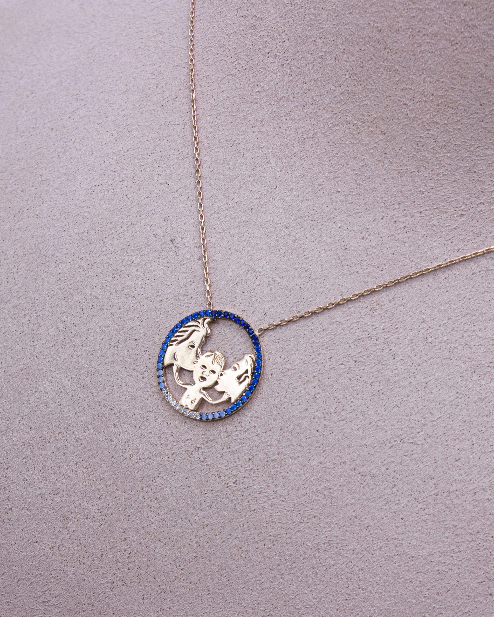 Celebrate the warmth of family with this beautifully crafted Turkish 925 Silver Necklace, featuring a heartfelt design of two parents lovingly embracing their child. The central figures are encased in a circular frame, adorned with shimmering blue and white crystals that add a vibrant yet refined touch.