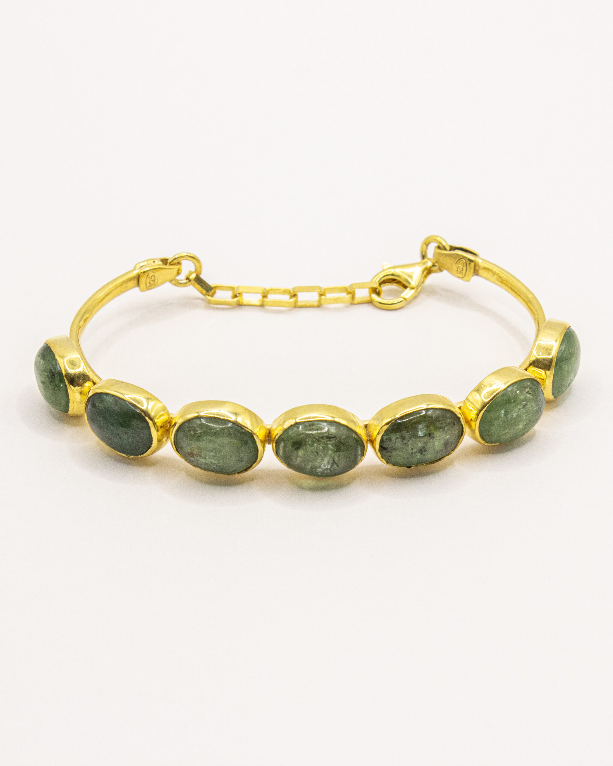 Design: Bracelet featuring a continuous row of oval-shaped Green Kyanite gemstones, each bezel-set in gold-toned silver