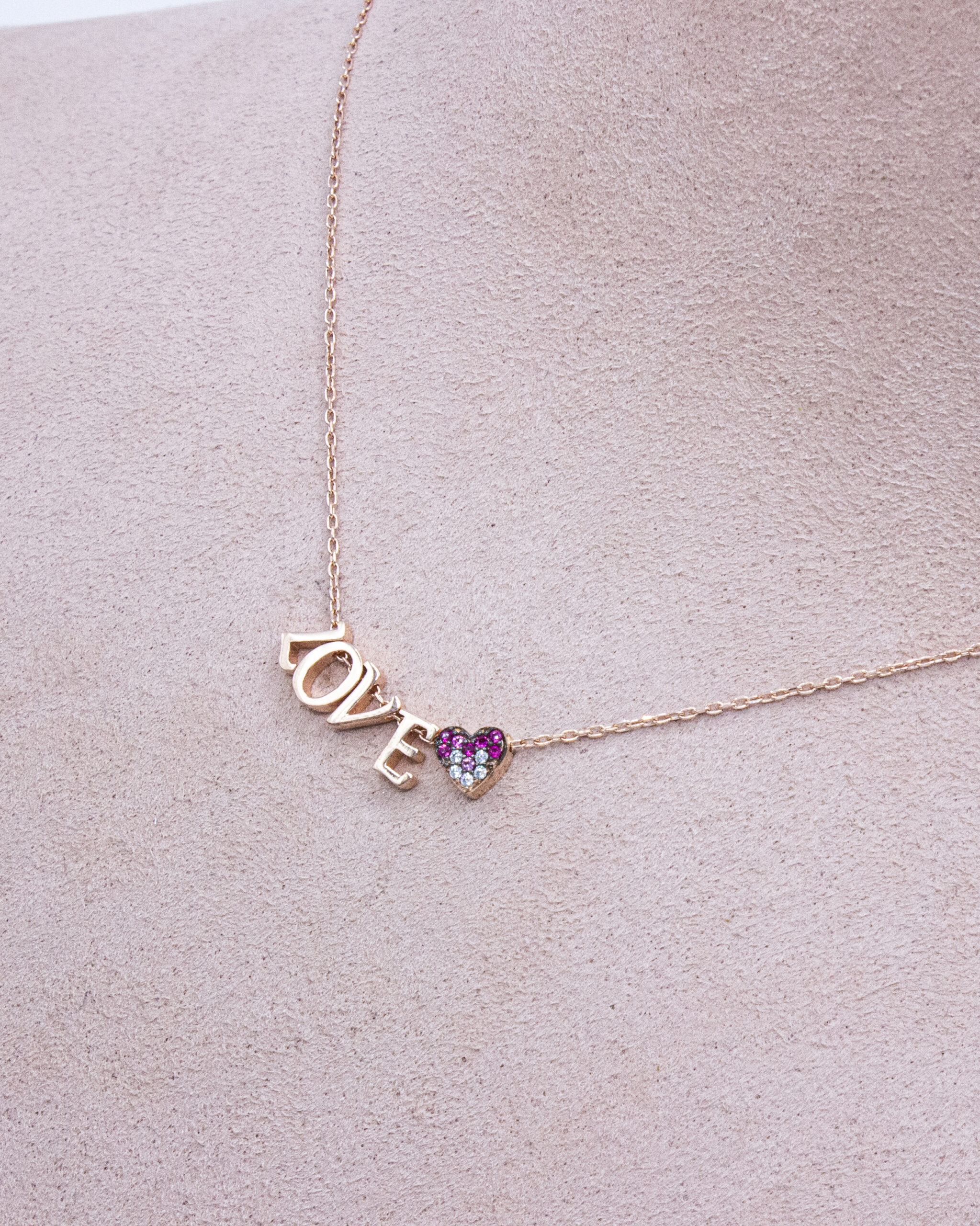 Design: Chain necklace with “LOVE” script pendant, featuring a heart-shaped ‘V’ and ‘E’ adorned with pink and white crystals