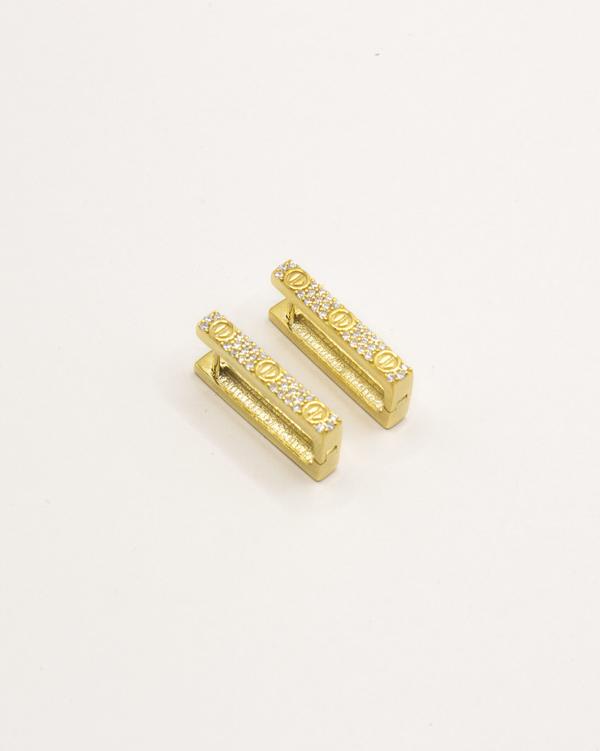 Design: Rectangular bar earrings with pave-set cubic zirconia and screw-head motifs