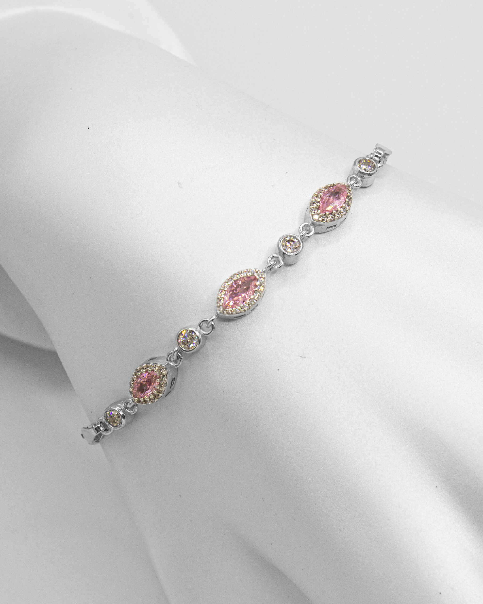 What makes this bracelet truly stand out are the three prominent centerpiece links, each showcasing a larger, captivating pink marquise-cut gemstone, likely a pink cubic zirconia or synthetic sapphire. These larger pink stones are also beautifully framed by a halo of smaller, clear pave-set zircons, amplifying their brilliance and adding a feminine touch. This bracelet is perfect for adding a pop of vibrant color and sophisticated sparkle to any ensemble, from a casual outing to an evening event.