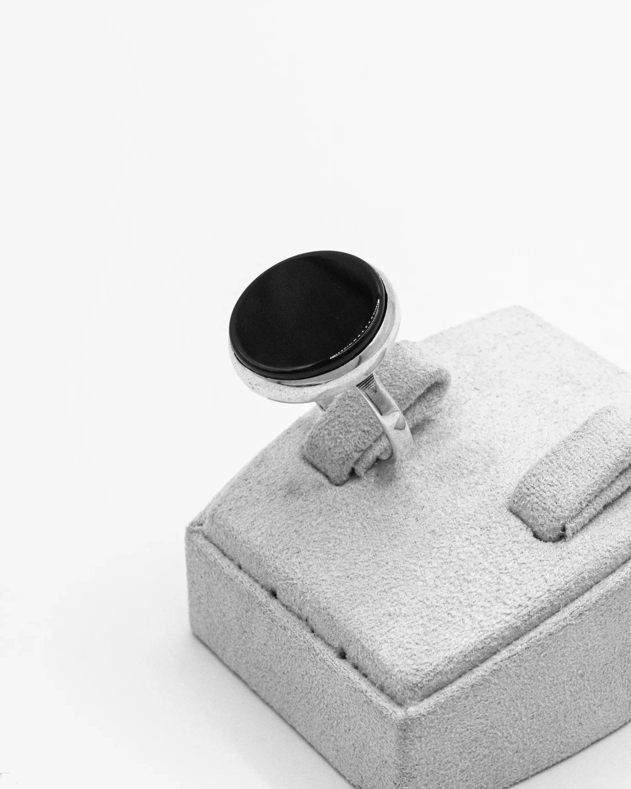 Design: Prominent round black ceramic inlay set in a polished silver bezel, with a simple, strong silver band