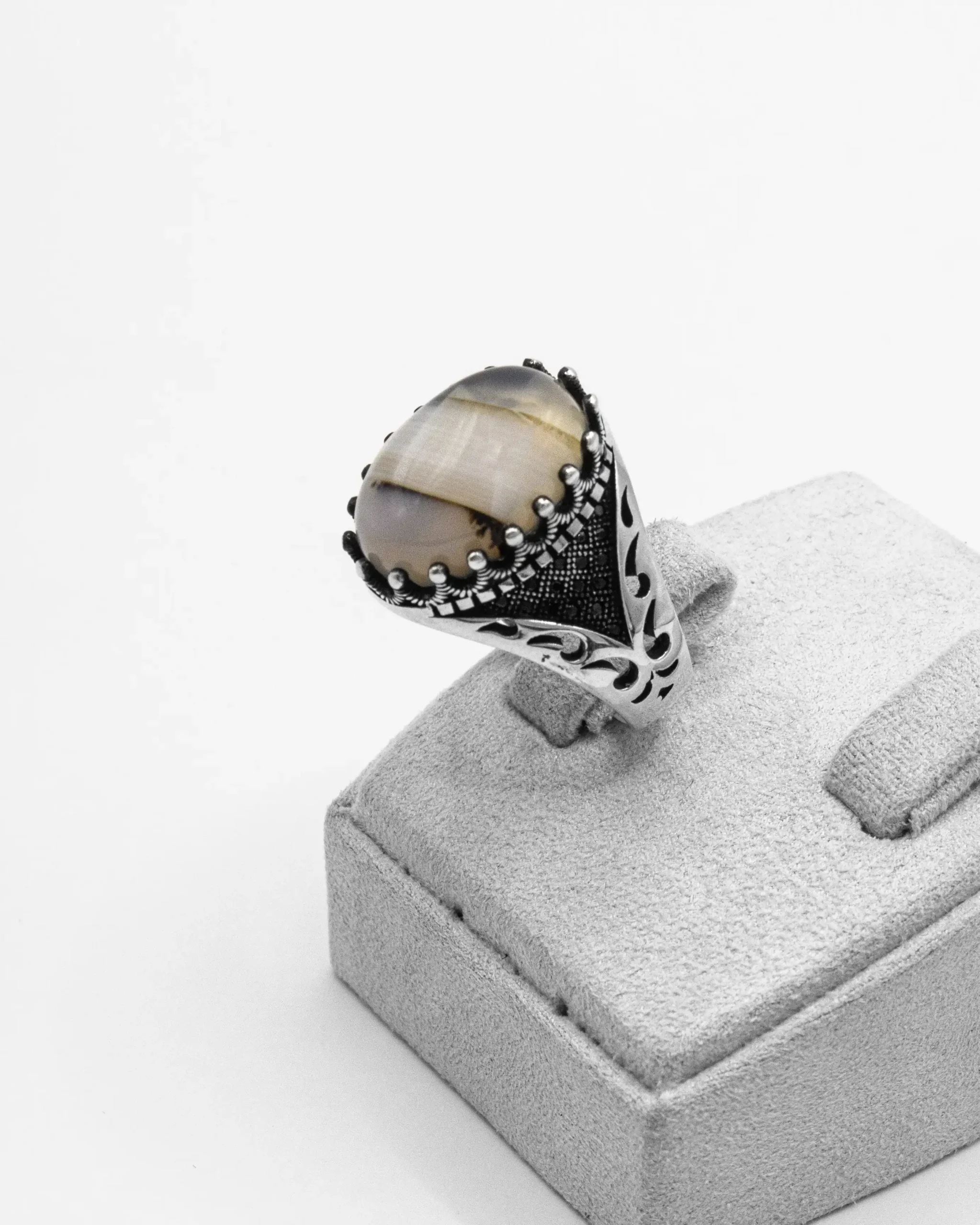 Command attention with the “Natural Agate” Turkish 925 Silver Men’s Ring, a uniquely captivating piece meticulously crafted for those who appreciate the raw beauty of natural stones and intricate silverwork. This substantial ring features a prominent, oval-shaped cabochon of natural agate, showcasing mesmerizing bands of cream, grey, and possibly faint brown, creating a unique and organic pattern.