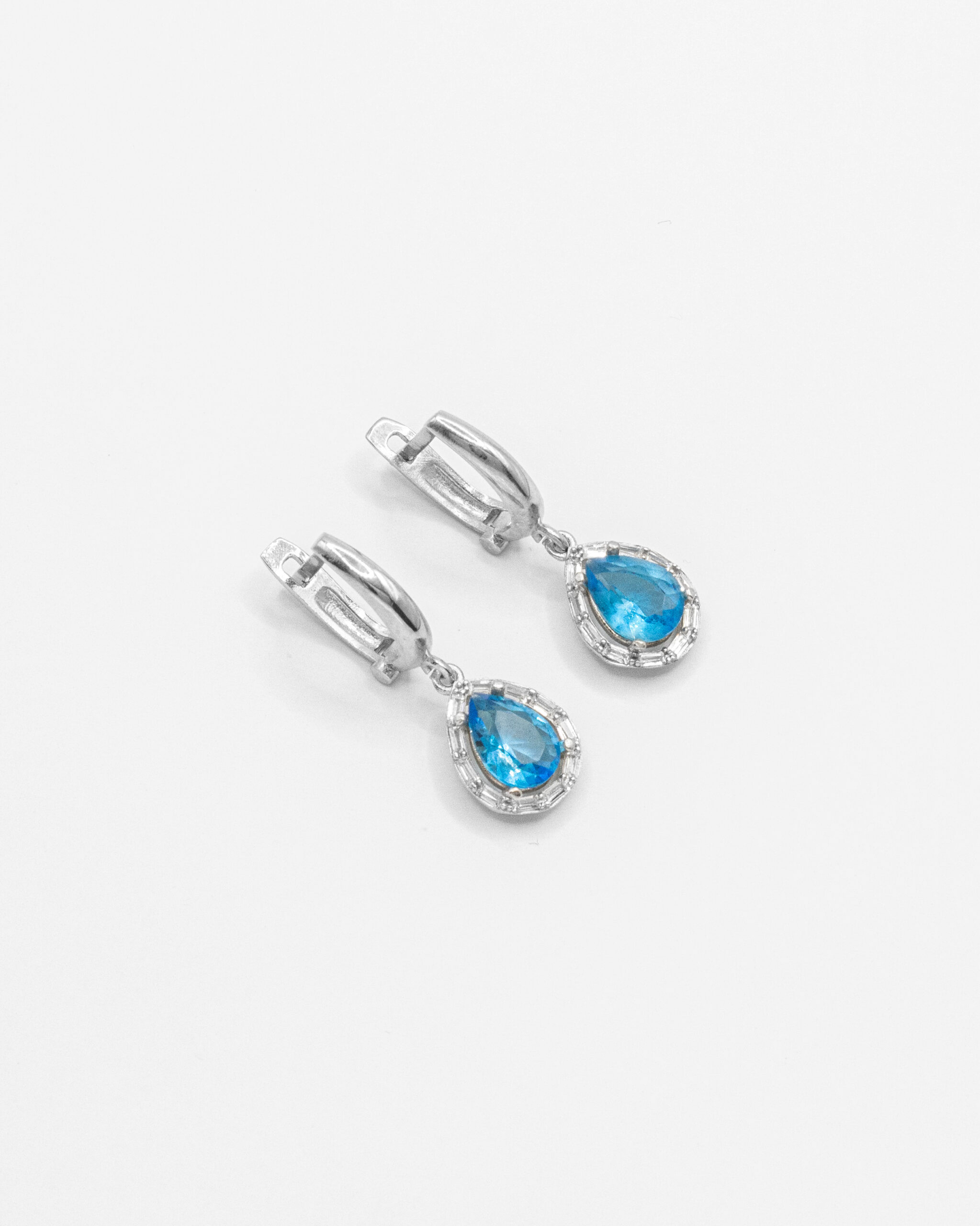 Design: Drop earrings with a pear-shaped blue gemstone surrounded by a crystal halo