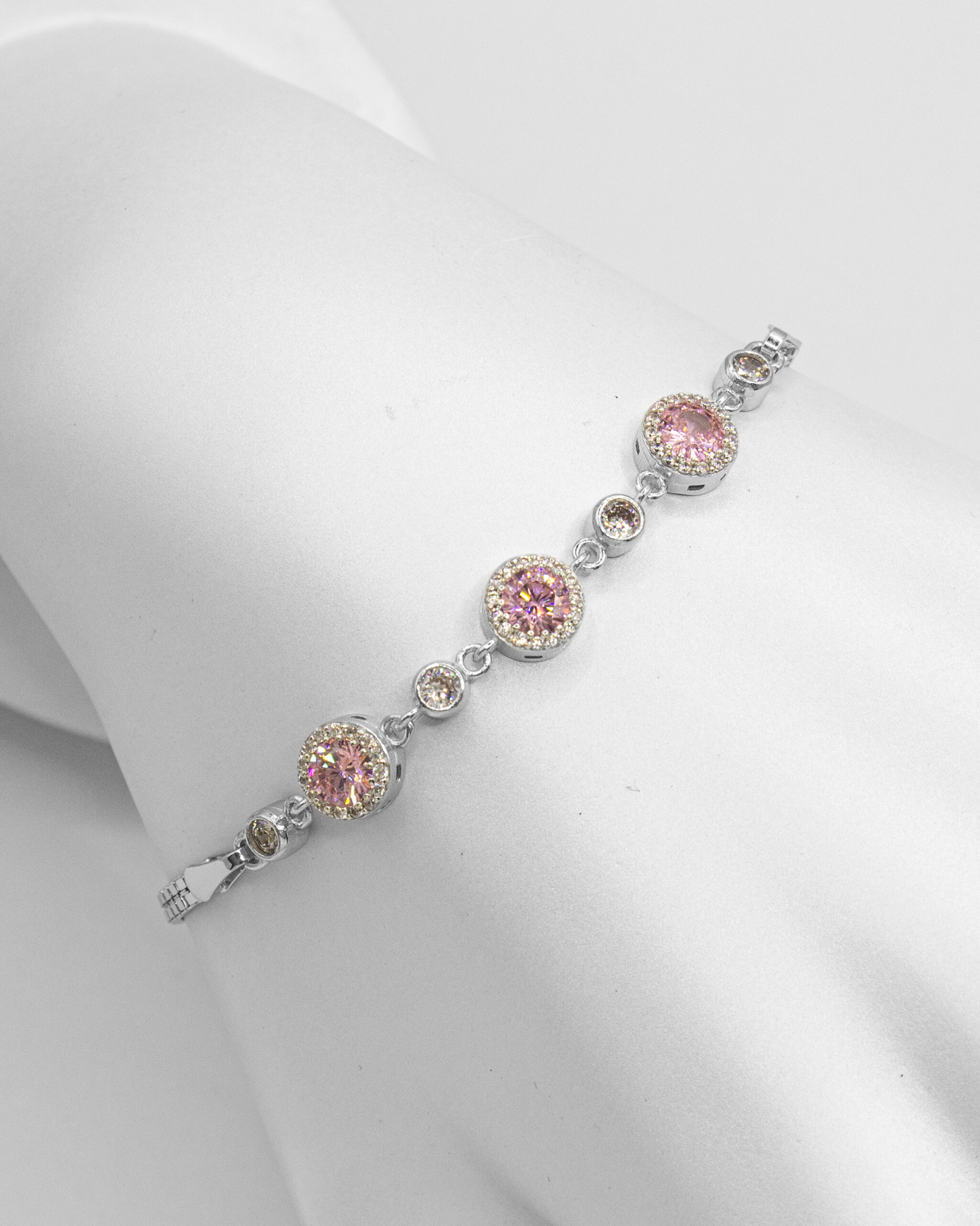 What truly makes this bracelet unique are the three prominent centerpiece links, each showcasing a larger, vibrant pink round gemstone, likely a pink cubic zirconia or synthetic sapphire. These larger pink stones are also framed by a halo of clear pave-set zircons, amplifying their sparkle and adding a feminine touch. This bracelet is perfect for adding a pop of vibrant color and sophisticated sparkle to any ensemble.