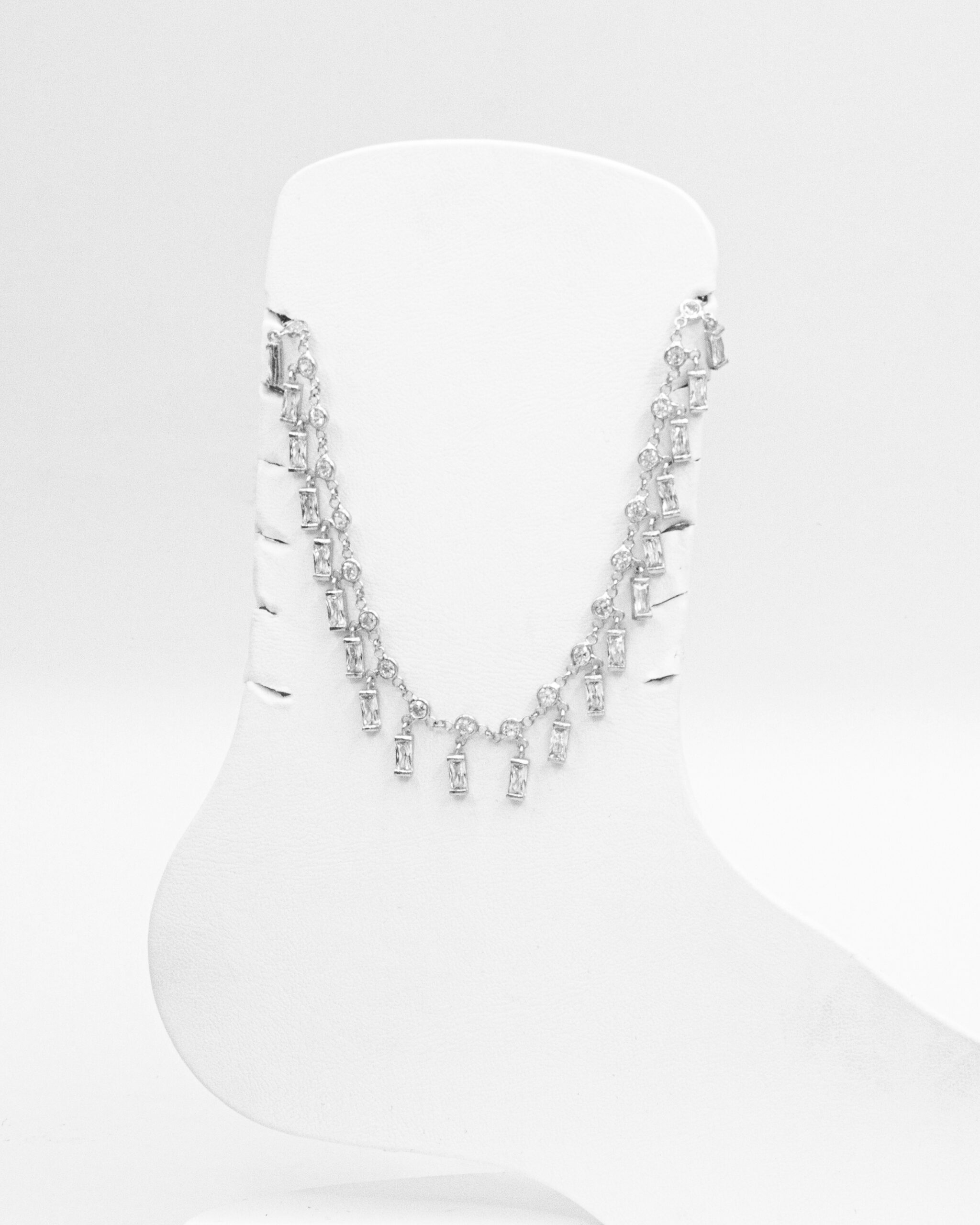 Crafted from high-quality sterling silver, the anklet showcases a series of finely linked chains that gracefully drape around the ankle. Suspended from these chains are an array of dazzling, clear cubic zirconia stones, primarily in elegant baguette cuts, interspersed with smaller round stones. These meticulously set gems create a mesmerizing dangling effect, catching the light with every movement and evoking the brilliance of a waterfall of diamonds. Finished with a high-polish shine, this anklet is a statement of refined elegance, perfect for enhancing your style with a touch of radiant luxury.