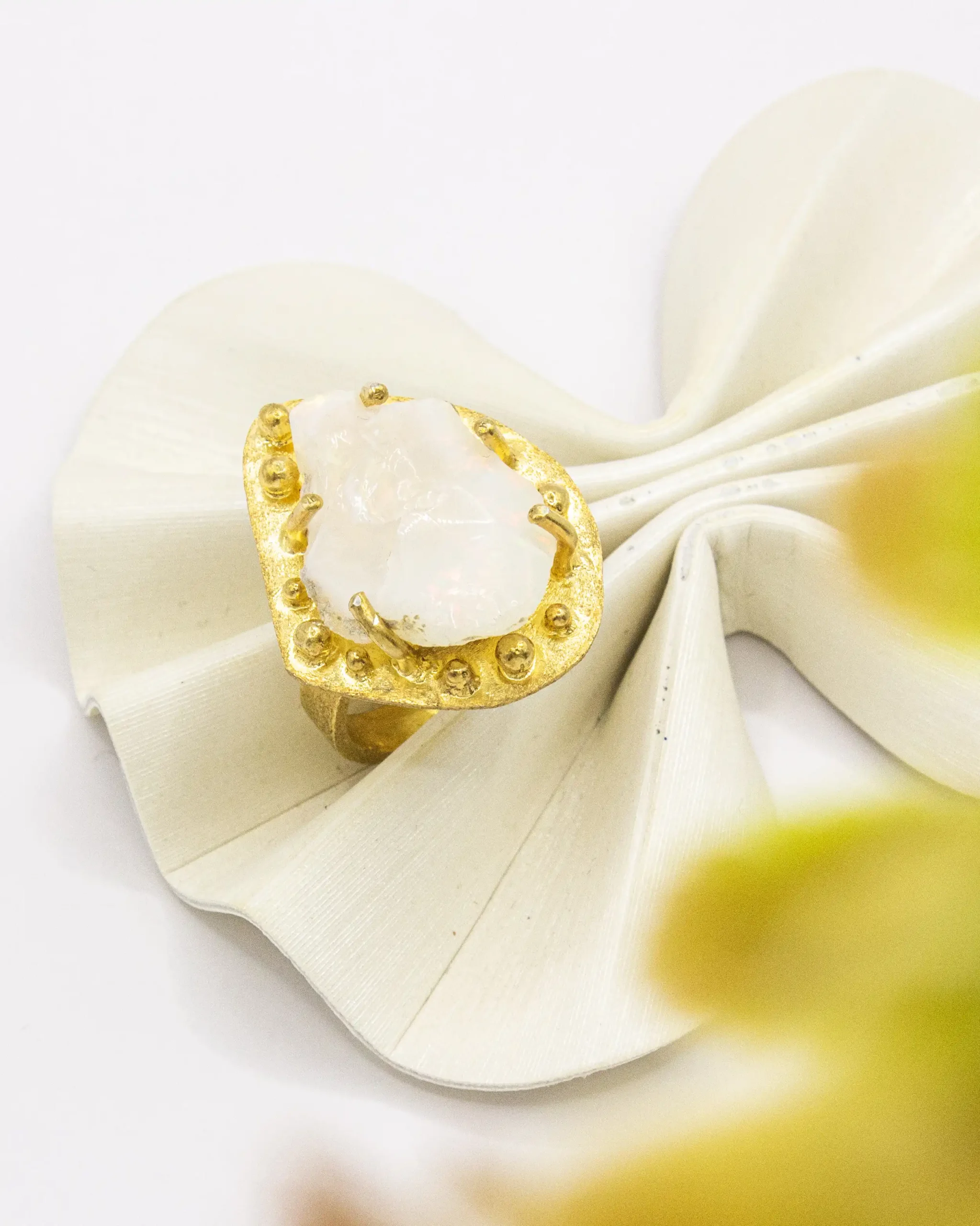 At its heart, a magnificent, raw moonstone gemstone takes center stage. Uncut and unpolished, its natural form, translucent glow, and characteristic adularescence (a soft, ethereal sheen) are celebrated, making each ring truly one-of-a-kind. The moonstone is securely held by rugged, organic prongs that further enhance its rustic charm and connection to the earth.