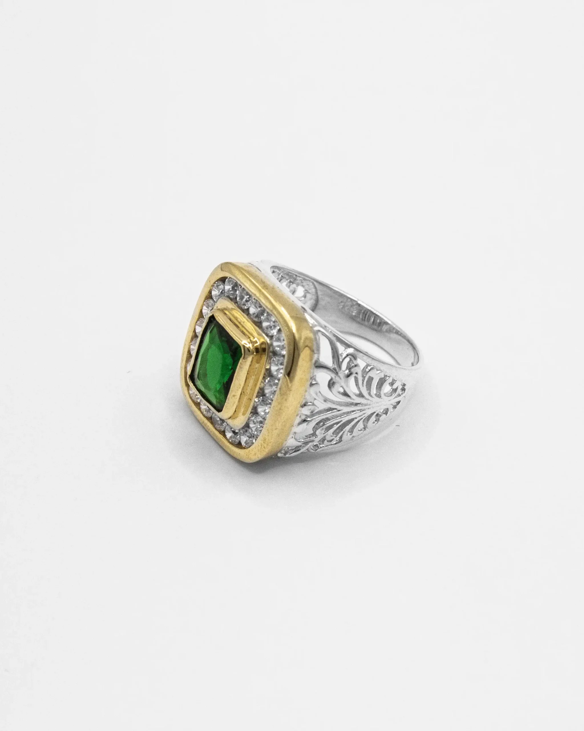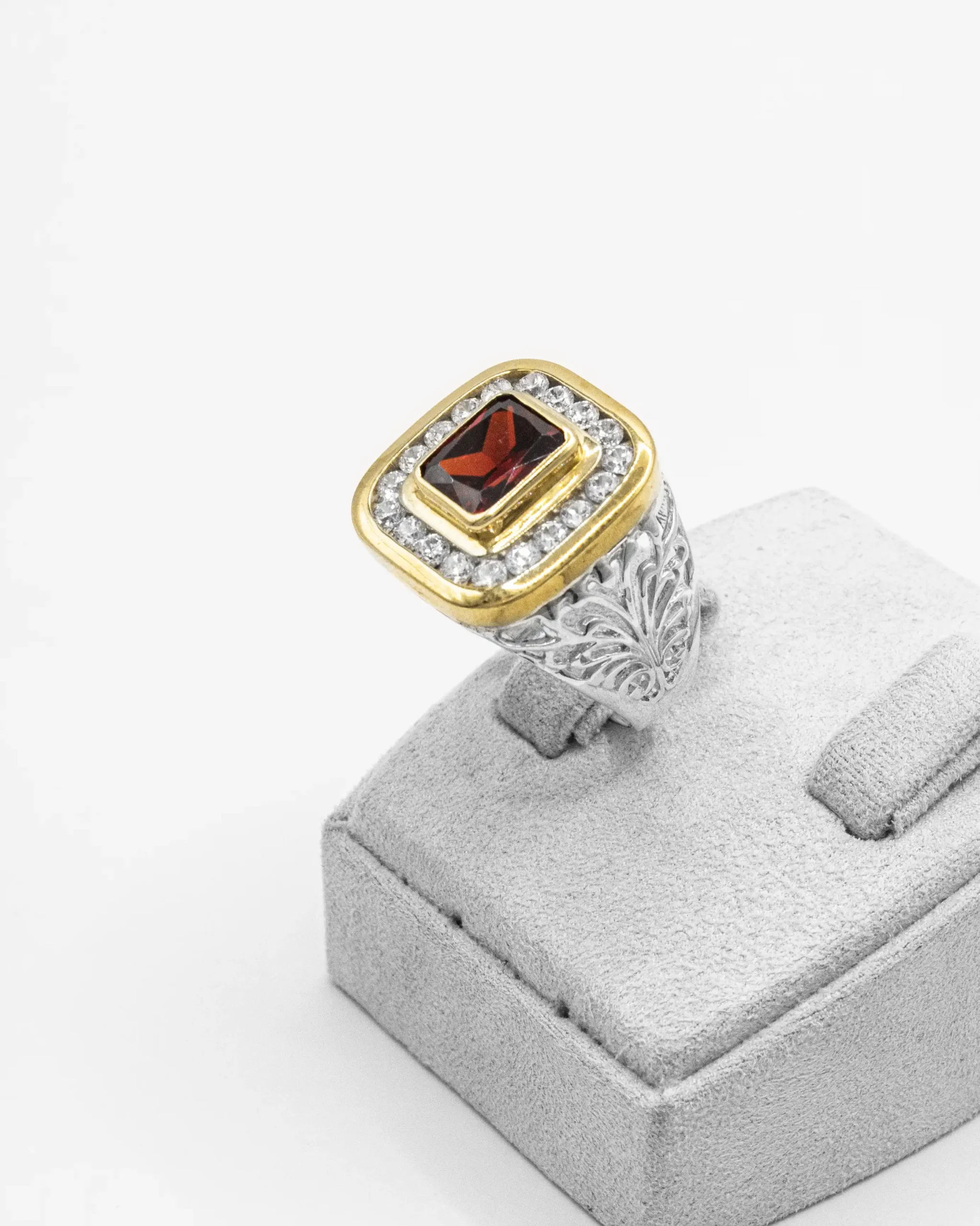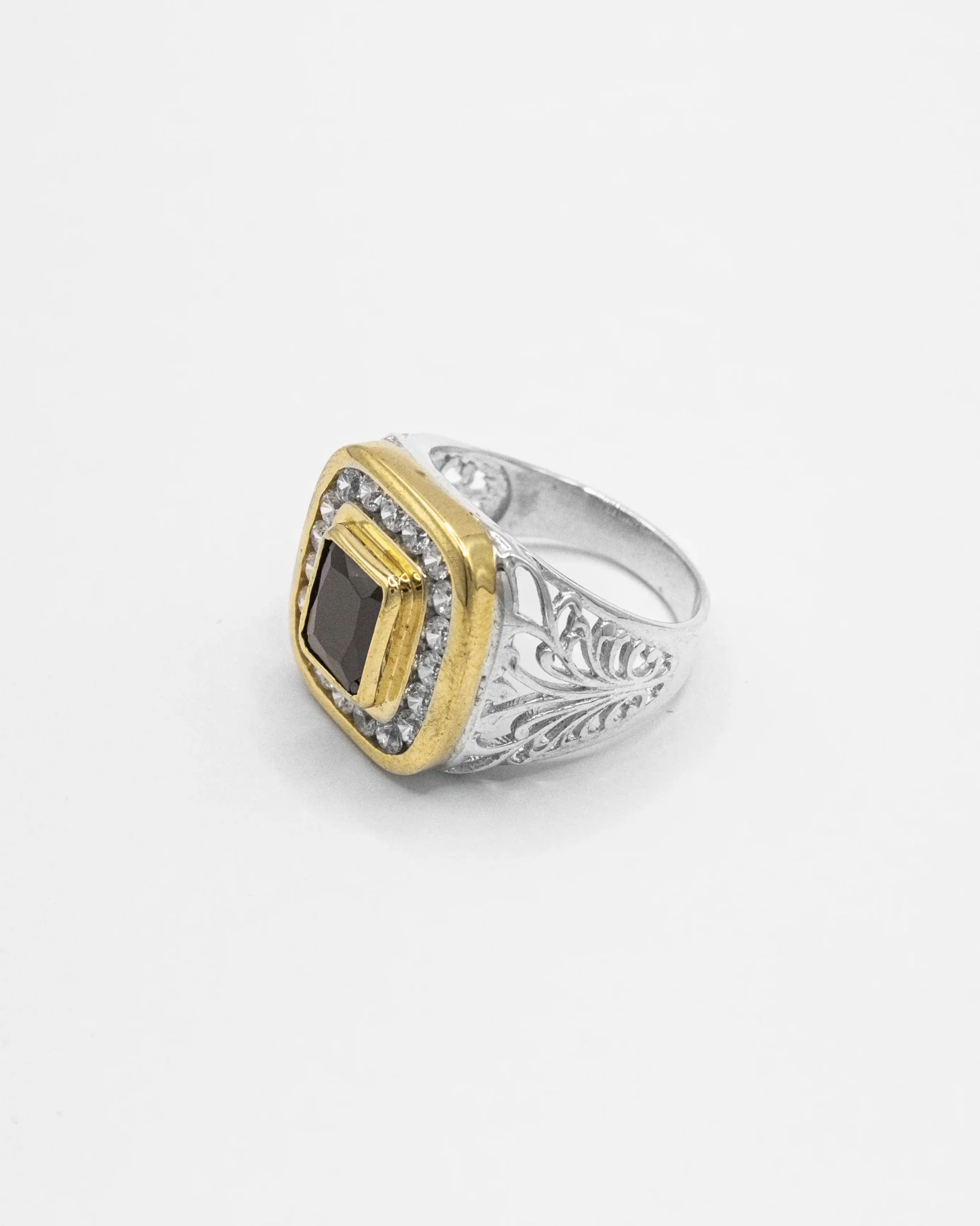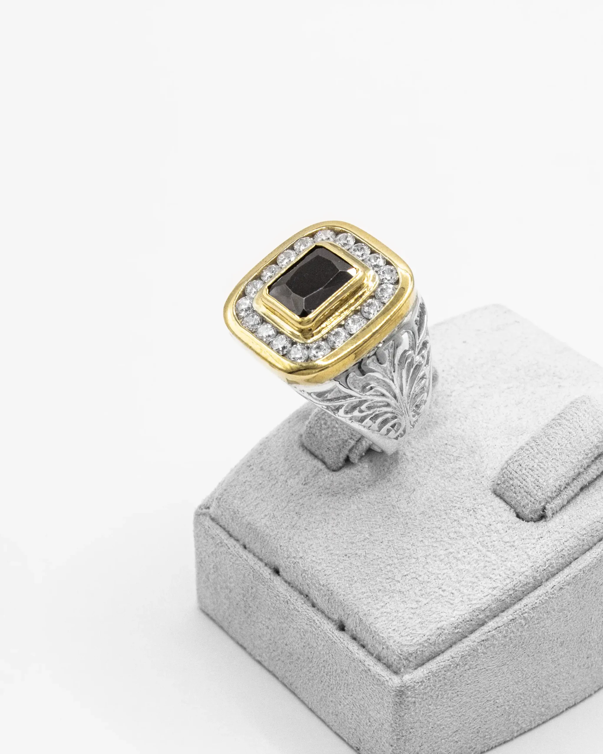 The substantial sterling silver band is a masterpiece of artistry, with its shoulders intricately adorned with beautifully sculpted, flowing leaf or scroll patterns. These details are enhanced with an oxidized finish, highlighting every delicate curve and adding a vintage, aristocratic aesthetic. Made from high-quality sterling silver with opulent gold-toned accents, this ring is a standout accessory for men who favor strong, statement-making jewelry that embodies power, sophistication, and exquisite craftsmanship.