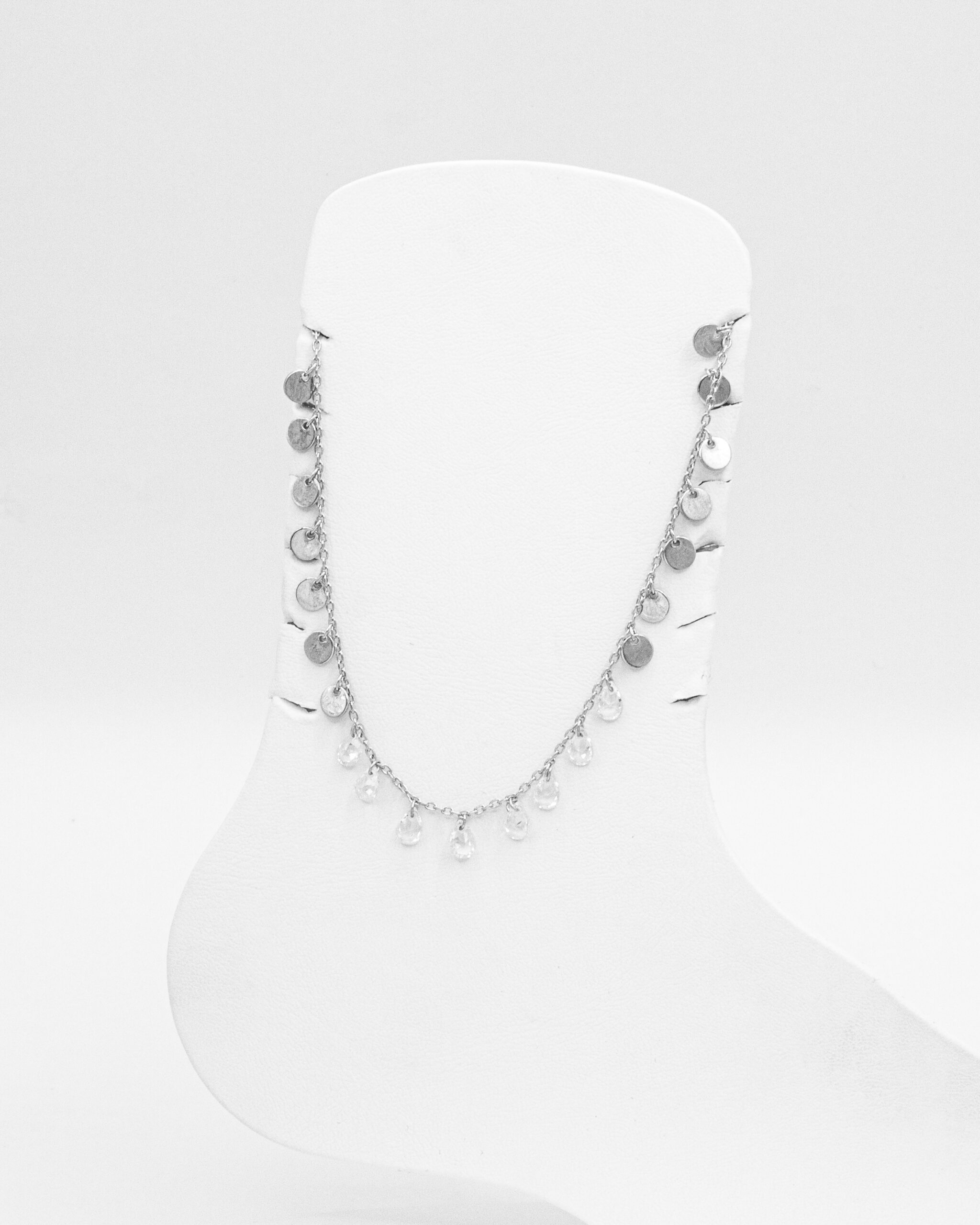 The design is a charming symphony of contrasting textures and reflections. Along one portion of the chain, small, polished silver disc charms are suspended, creating a soft, coin-like shimmer with every movement. Transitioning seamlessly, the other portion of the anklet features an array of dazzling, faceted clear beads, which capture and refract light with brilliant clarity. This thoughtful combination of matte silver and sparkling facets creates an eye-catching effect, making this anklet a versatile accessory that beautifully complements both casual and dressier ensembles, bringing a hint of bohemian chic and effortless glamour.
