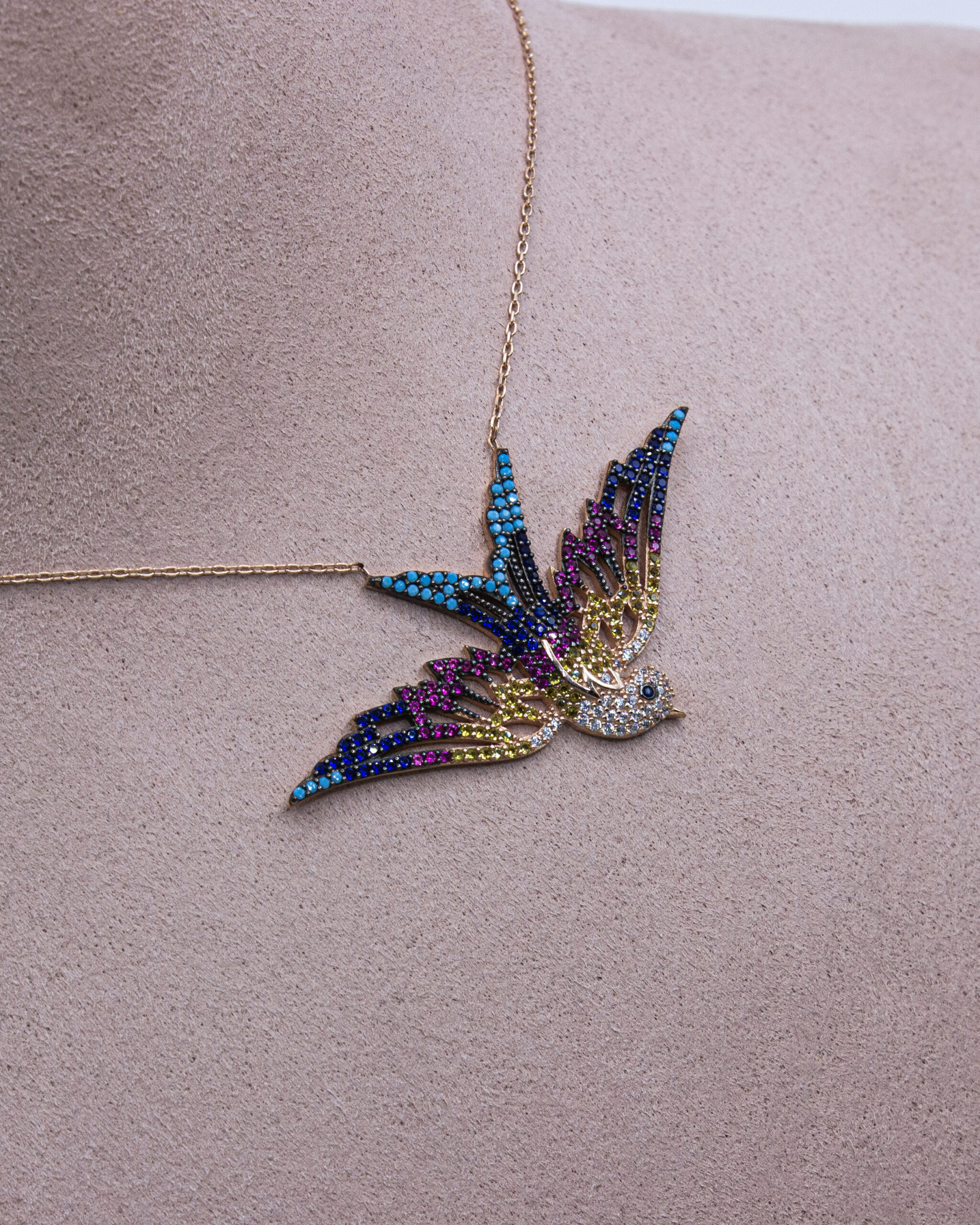 This elegant necklace features a striking pendant in the shape of a flying bird, beautifully encrusted with multicolored gemstones. The bird’s wings are adorned with vibrant turquoise, deep blue, amethyst purple, and golden yellow stones, arranged in a radiant, gradient-like pattern that captures movement and grace. Its body and head are encrusted with shimmering clear stones, with a vivid blue stone forming the bird’s eye. The pendant is set on a delicate, fine chain in a warm gold tone, complementing the intricate, colorful detailing of the pendant. This piece exudes both charm and sophistication, making it a standout accessory for any occasion.