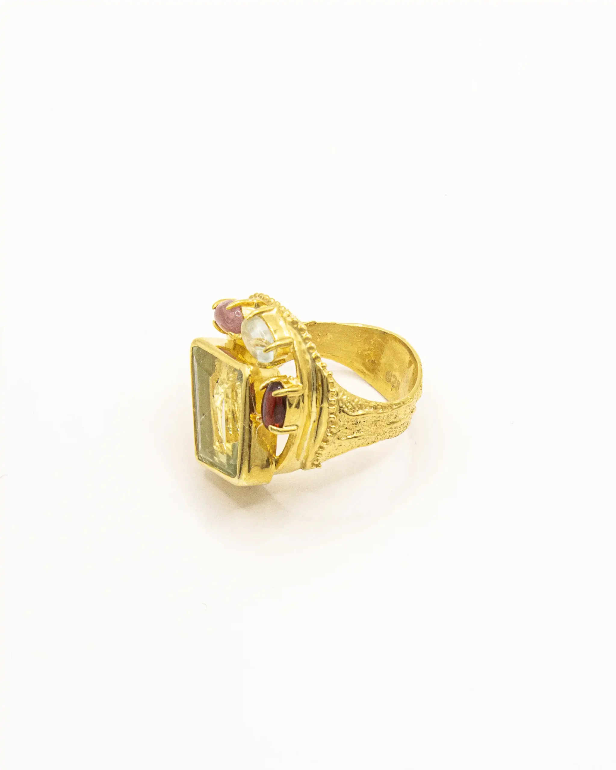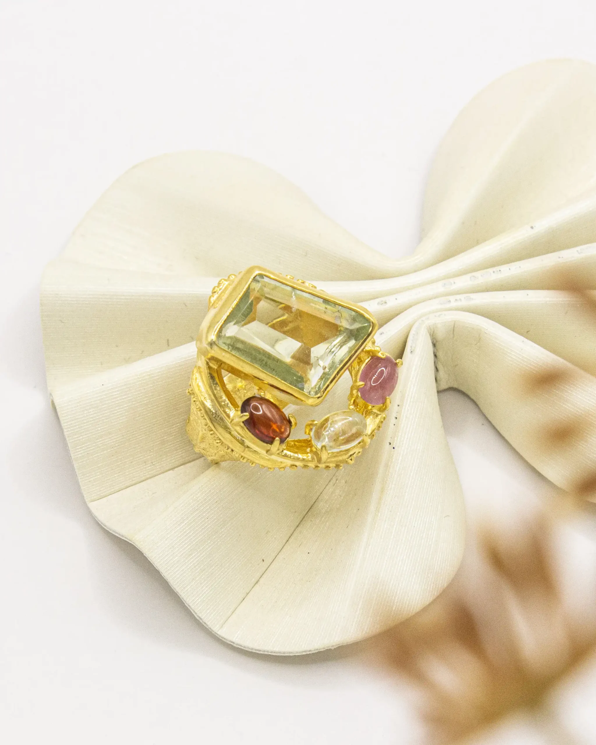 Meticulously fashioned from genuine Turkish 925 sterling silver, this ring boasts a rich, textured gold-tone finish that beautifully highlights its array of dazzling gemstones. The centerpiece is a prominent, rectangular faceted Prasiolite (or Lemon Quartz) in a luminous yellowish-green hue. Complementing it are a harmonious cluster of smaller, bezel-set precious stones: a deep red Garnet, a delicate pink Tourmaline (or Rose Quartz), and a sparkling clear White Topaz (or Clear Quartz). The band itself features a unique hammered texture, adding to the artisanal charm. This ring is a wearable work of art, designed to draw admiration and elevate any ensemble with its eclectic elegance.