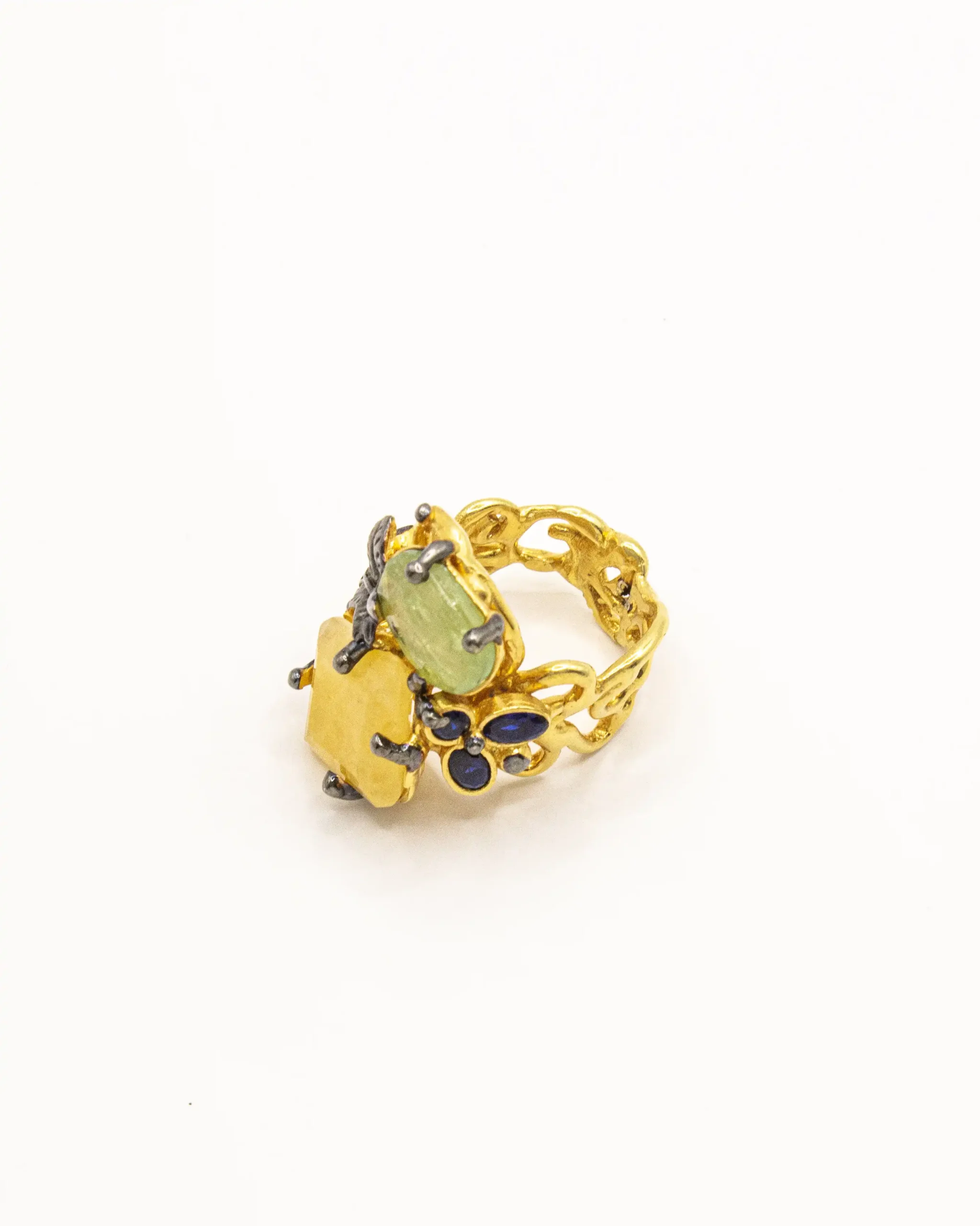 This eye-catching ring is adorned with a trio of prominent, naturally shaped gemstones. A radiant citrine (or yellow topaz) gleams with warm, golden hues, while a lively peridot (or light green tourmaline) offers a refreshing splash of apple green. Complementing these, a cluster of deep blue sapphires (or lapis lazuli) adds a touch of intense, oceanic color, completing this striking palette. The stones are secured by rugged, dark prongs that provide a captivating contrast to the polished silver and vibrant gems.